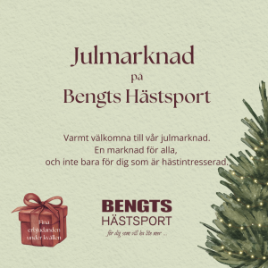 Vi på Bengts hästsport bjuder in er alla till vår årliga julmarknad, varmt välkomna den onsdagen den 17 december. En marknad för alla och inte bara för dig som är hästintresserad. Kom, fynda julklappar eller bara träffas under en mysig eftermiddag och kväll hos oss på Bengts Hästsport.
