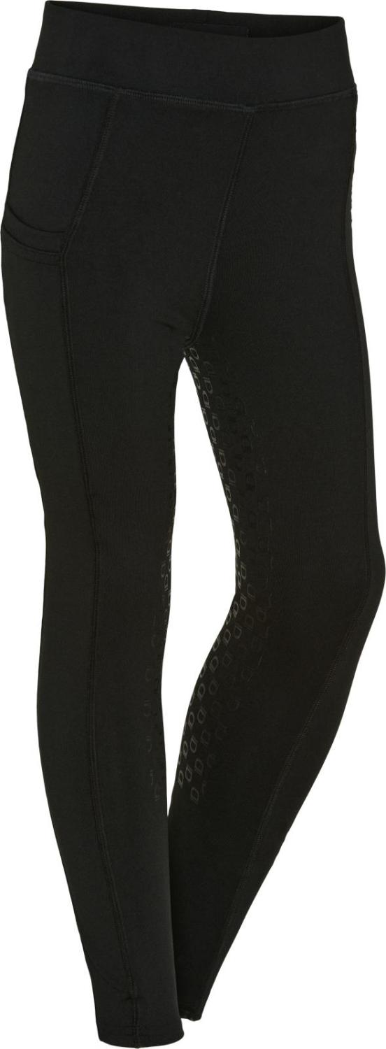 Sköna ridtights för barn från Equipage är designade för både komfort och funktion. Midjan på ridtightsen har ett elastiskt band på insidan samt en justerare med knappresår på insidan, vilket gör att tightsen kan anpassas perfekt efter barnet. Sidopanelerna ger en snygg design och en praktisk ficka på höger sida rymmer både mobiltelefon och snacks. Tightsen har ett litet tryck med stigbygelmotiv och full silicone-seat som ger extra grepp i sadeln. De är lämpade för användning året runt, vilket gör dem till ett mångsidigt val för unga ryttare.