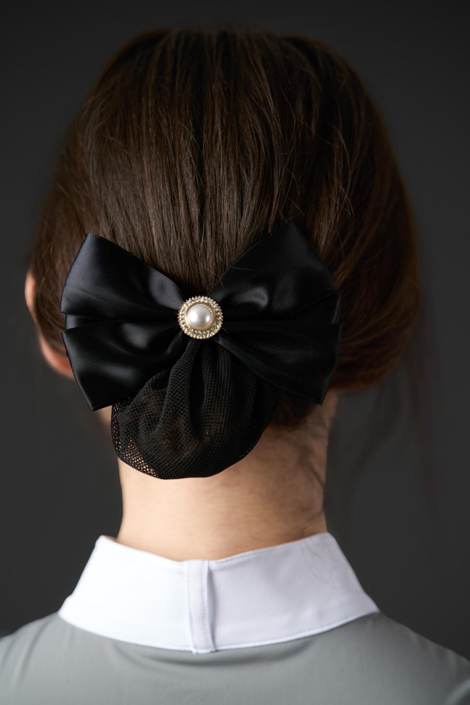 Detta hårnät har en rosett och en stor dekorativ pärla med paljetter, vilket gör det både elegant och lekfullt. Hårnätet håller håret på plats på ett snyggt och prydligt sätt, samtidigt som det tillför en dekorativ detalj under ridning eller tävling.