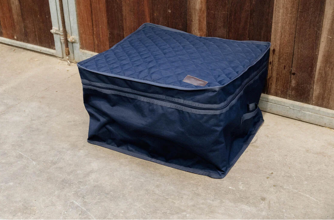 Väskan är perfekt för att förvara dina Kentucky-produkter på ett säkert sätt, och den håller dem fria från mögel och smuts. Den rymliga designen gör det enkelt att förvara både täcken och sadelpadar, och ventilationssystemet på baksidan ger bra luftcirkulation för att hålla dem fräscha.